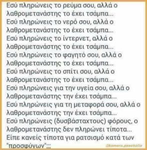 Ο ΘΑΝΑΤΟΣ ΣΟΥ, Η ΖΩΗ ΜΟΥ Δεν φοβάμαι τους Τούρκους, δεν φοβάμαι τους λαθρομετανάστες. Φοβάμαι τους νεοέλληνες ραγιάδες. Φοβάμαι αυτούς που ασυνείδητα αυτούς που χωρίς ψυχή σκοτώνουν τους Έλληνες συμπολίτες τους λέγοντας “την δουλειά μου κάνω, εντολές εκτελώ!” ΕΝΤΟΛΕΣ ΕΚΤΕΛΩ!!!!!!!! Οι νεοραγιάδες, ευθύνονται για την γενοκτονία των Ελλήνων!! Σου ζητάνε φόρους παράνομους και καταχρηστικούς, …
