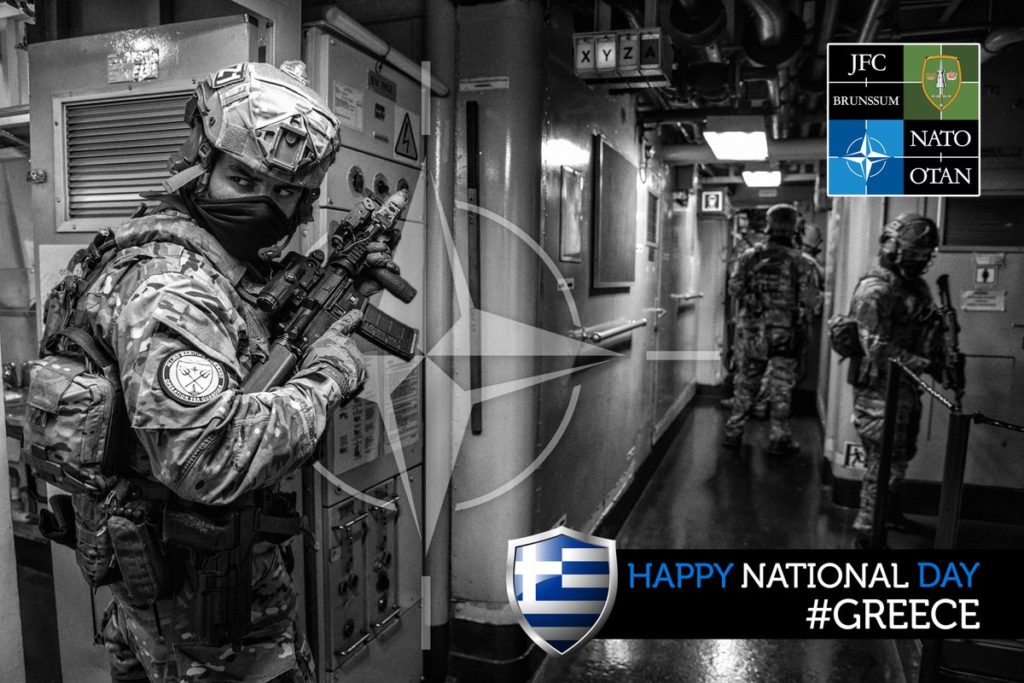 Είναι γνωστό ότι στα πλαίσια της διαδικτυακής καμπάνιας #WeAreNATO με αφορμή τα 70χρονα της συμμαχίας που πλησιάζουν σε λίγες μέρες, ο φιλάνθρωπος αυτός οργανισμός επιχειρεί να μας θυμίσει τις όμορφες στιγμές που περάσαμε μαζί, τα πλεονεκτήματα που μας φέρνει η συμμετοχή σε αυτό, αλλά και για να δείξει ότι λαμβάνει υπόψη την ιδιαίτερη ταυτότητα κάθε κράτους – μέλους. Το τελευταίο στοιχείο είναι αυτό που κυριαρχεί στην τελευταία ανάρτηση, προερχόμενη από το λογαριασμό του νατοϊκού στρατηγείου στο ολλανδικό Brunssum, όπου μας εύχεται “Ευτυχισμένη Ημέρα Ελληνικής Ανεξαρτησίας”, διευρύνοντας παράλληλα τους γνωστικούς ορίζοντες των αναγνωστών ρωτώντας τους “αν ήξεραν πως η Ελλάδα μπήκε στη συμμαχία το 1952”: