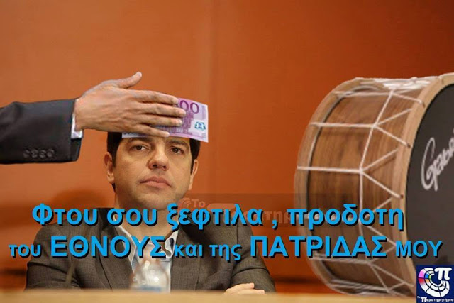 Το κέντρο της οργής σε τούτες τις εκλογές. Φτου σου παλιάνθρωπε! Άλλα υποσχέθηκες και άλλα έκανες. Αντί να καταργήσεις τα μνημόνια με έναν νόμο, μας φόρτωσες και τρίτο αρχηγάϊδαρε!, χώρια ότι ξεπούλησες τη Μακεδονία για ένα πινάκιο φακής!