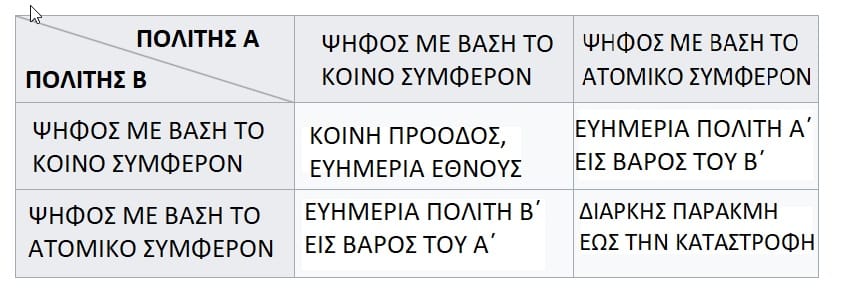 Μία παραλλαγὴ τῆς γνωστῆς Θεωρίας των Παιγνίων μᾶς ἐξηγεῖ πολὺ ἁπλᾶ γιατί ἐφθάσαμε ἔως ἐδῶ[2] καὶ θὰ πᾶμε ἀκόμη παρακάτω.