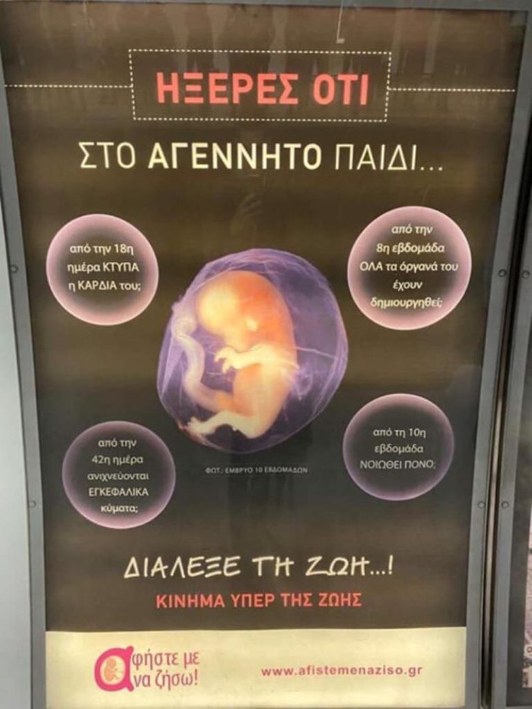 Μετρό: Φωτογραφίες με τις επίμαχες αφίσες, ενός προπαγανδιστικού site που έχει σαν κεντρικό μήνυμα «Αφήστε με να ζήσω», αναδημοσιεύονται από πολλούς χρήστες του Facebook και οι αντιδράσεις είναι έντονες. Στις αφίσες διαβάζει κανείς: «Ήξερες ότι από την 18η ημέρα κτυπά η καρδιά του; Από την 42η μέρα ανιχνεύονται εγκεφαλικά κύματα; Από την 8η εβδομάδα όλα τα όργανά του έχουν δημιουργηθεί; Από την 10η εβδομάδα νοιώθει πόνο. Διάλεξε τη ζωή».