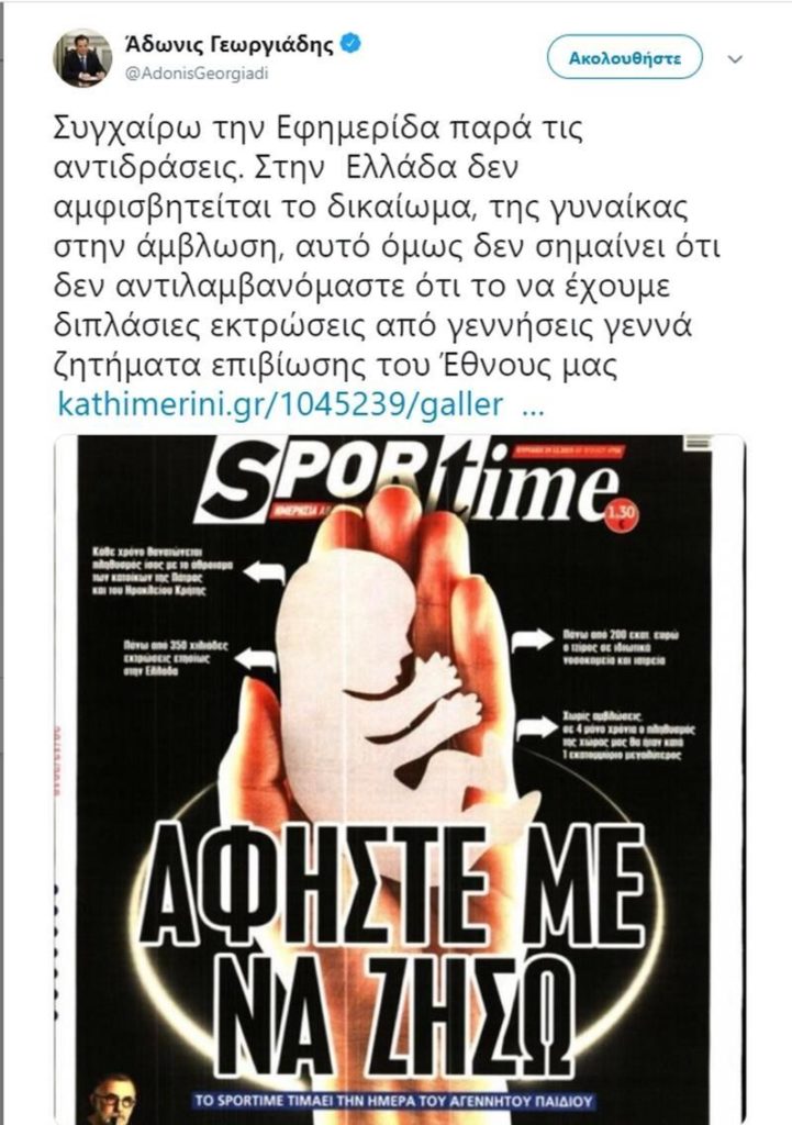 Ο Στάθης Τσαγκαρουσιάνος έγραψε στη Lifo ένα άρθρο με τίτλο «Οι αμβλώσεις είναι γυναικείο δικαίωμα και νόμος του κράτους. Τέλος συζήτησης» και πράγματι το άρθρο θα μπορούσε να τελειώνει εδώ. Όμως είναι εύστοχος και ο υπότιτλος: Η πολύ περίεργη συζήτηση που ξέσπασε περί αμβλώσεων, παραμονές του 2020, με την συνδρομή του αντιπροέδρου τoυ κυβερνώντος κόμματος, είναι ένας επικίνδυνος αναχρονισμός, όπως και η αρχή του άρθρου: Δεν προκαλεί έκπληξη το εξώφυλλο του Sportime, σε όσους ζουν στην Ελλάδα. Υπάρχει ένα υπολογίσιμο κομμάτι του πληθυσμού που πιστεύει ότι η έκτρωση είναι έγκλημα απέναντι σε θεό και ανθρώπους. Ο θεός ας τιμωρήσει τους «εγκληματίες» όπως θέλει. Οι άνθρωποι όμως -δηλαδή το κράτος- έχουν νόμο, σύμφωνα με τον οποίο η έκτρωση δεν είναι έγκλημα, αλλά δικαίωμα (Νόμος 1609/1986, σε ισχύ από τις 3 Ιουλίου 1986). Έκπληξη λοιπόν προκαλεί το ότι ο Αντιπρόεδρος του κυβερνώντος κόμματος Άδωνις Γεωργιάδης βγαίνει να το σιγοντάρει. Νόμιζα ότι δουλειά της κυβέρνησης είναι πρωτίστως να υπερασπίζεται τους νόμους του κράτους.