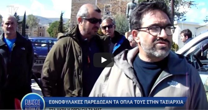 Δεκάδες συμπολίτες μας Εθνοφρουροί, συγκεντρώθηκαν στην Ταξιαρχία με τον οπλισμό τους, όπλο και κιβώτιο με σφαίρες στην Ταξιαρχία, με στόχο να τον παραδώσουν διαμαρτυρόμενοι για την βιαιότητα των ΜΑΤ και την Κυβερνητική πολιτική βίας στο μεταναστευτικό – προσφυγικό πρόβλημα.