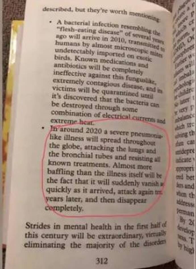 “Μια σοβαρή πνευμονικού τύπου πανδημία  θα εξαπλωθεί σε όλη τη γη. Θα προσβάλει τους πνεύμονες και τους βρόγχους ανθιστάμενη σε όλα τα υπάρχοντα φάρμακα  και τις γνωστές θεραπείες. Όμως περισσότερο από όλα μας θα μας φέρει σε αμηχανία το γεγονός ότι θα εξαφανιστεί ξαφνικά και γρήγορα όπως ήρθε, και θα επανέρθει μετά από 10 χρόνια και τότε θα εξαφανιστεί οριστικά”, (Σελ.312 του βιβλίου της).