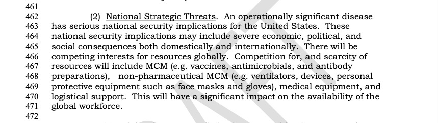 «Η πιο πιθανή και σημαντική απειλή, είναι μια νέα νόσος, που θα προσβάλει το αναπνευστικό σύστημα, ένας νέος ιός γρίπης», γράφει το έγγραφο του Πενταγώνου. Το Covid-19, είναι ακριβώς μία τέτοια περίπτωση. Το έγγραφο αναφέρεται συγκεκριμένα σε κορωνοϊούς, λέγοντας ότι οι «λοιμώξεις από κορωνοϊό παρατηρούνται σε όλο τον κόσμο». Το στρατιωτικό σχέδιο έκανε επίσης λόγο για ανεπάρκεια σε κλίνες στις ΜΕΘ. Πράγματι, οι κλίνες στις ΜΕΘ είναι σε έλλειψη στην Ιταλία, ενώ κοντεύουν να εξαντληθούν και στη Νέα Υόρκη.