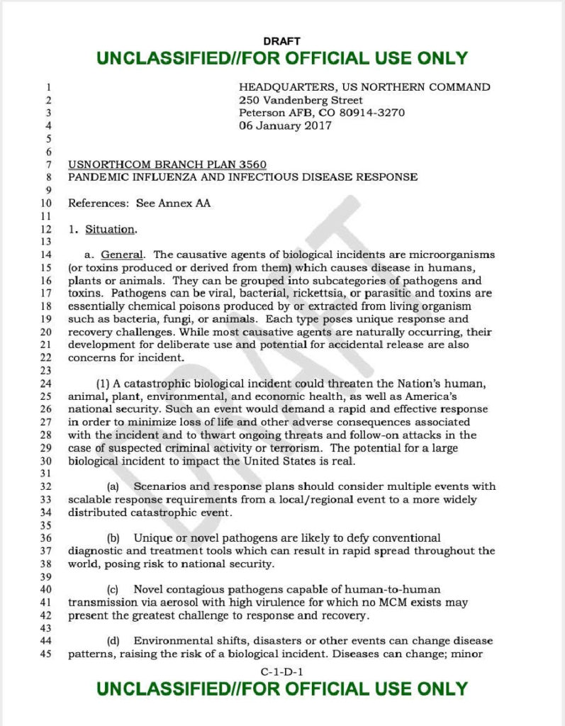 Στο σχέδιο με τον τίτλο «Σχέδιο USNORTHCOM 3560: Αντιμετώπιση πανδημικής γρίπης και λοιμώδους νόσου» έχει ημερομηνία 6 Ιανουαρίου 2017. Το σχέδιο δόθηκε στο The Nation από έναν υπάλληλο του Πενταγώνου, που ζήτησε να τηρηθεί η ανωνυμία, προκειμένου να αποφύγει τα αντίποινα από την πλευρά της ηγεσίας του στρατού.