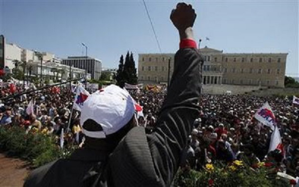 Υψωμένη γροθιά μετανάστη σε συγκέντρωση απέξω από την Ελλήνων Βουλή