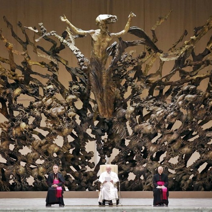 Pope Francis I is flanked by Swiss Guards as he sits under a wooden sculpture in the Paul VI general audience hall during an audience for members of the media, at the Vatican March 16, 2013. REUTERS/Paul Hanna (VATICAN – Tags: RELIGION) superb sculpture of demonic inspiration