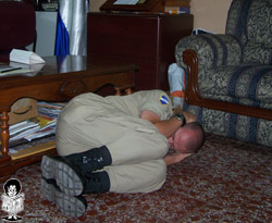 • Καλυφθείτε κάτω από κάποιο ανθεκτικό έπιπλο (τραπέζι, γραφείο, θρανίο), γονατίστε και κρατήστε με τα χέρια σας το πόδι του.