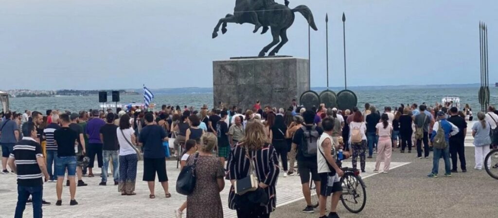 Συγκέντρωση διαμαρτυρίας κατά του εμβολιασμού και των μέτρων για τον κορωνοϊού πραγματοποιήθηκε σήμερα το απόγευμα στη Θεσσαλονίκη, μπροστά στο άγαλμα του Μεγάλου Αλεξάνδρου.Συγκεκριμένα, σύμφωνα με το GrTimes, δεκάδες πολίτες συγκεντρώθηκαν στην παραλία της Θεσσαλονίκης σήμερα, διαμαρτυρόμενοι για την επιχείρηση εξόντωσης των ανθρωπίνων δικαιωμάτων αλλά και για μια αφανή επίθεση.