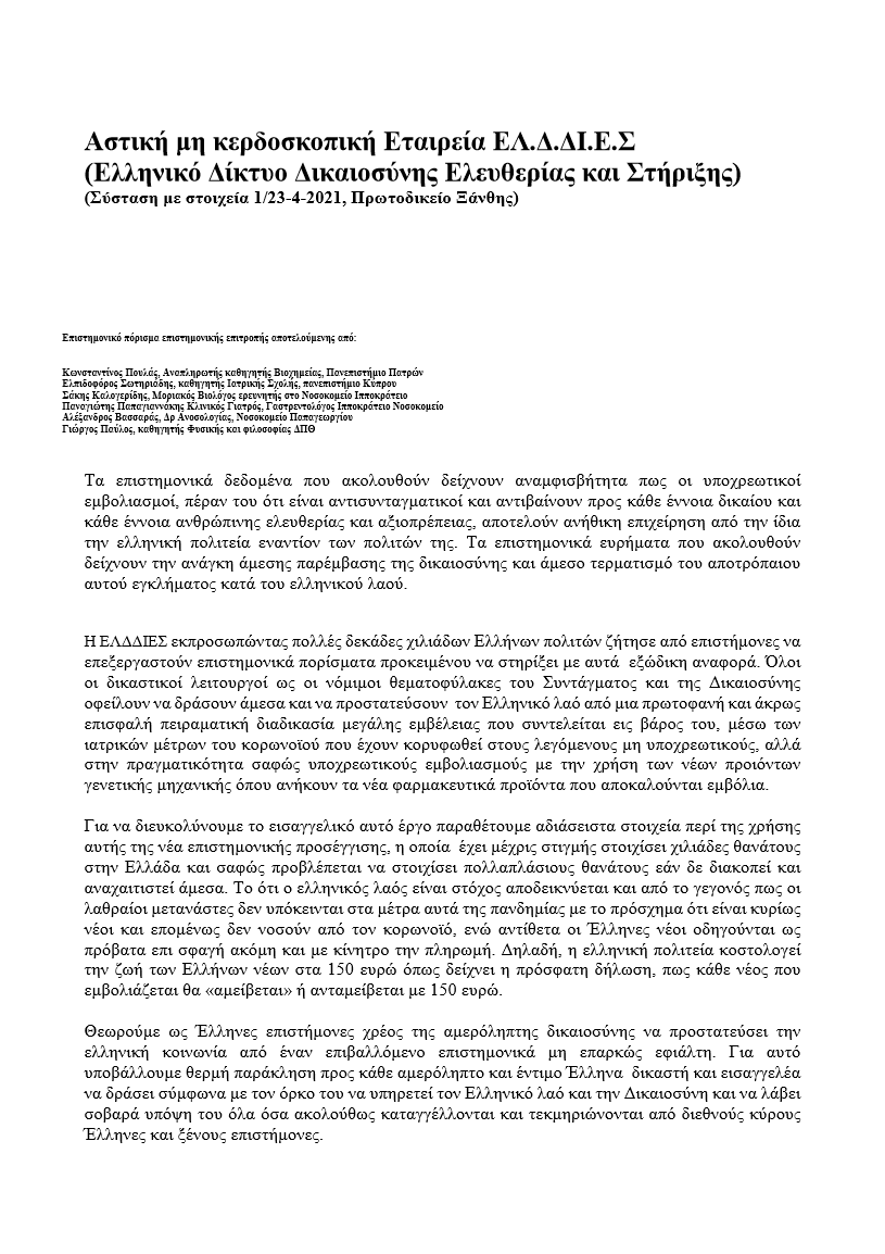 Θεωρούμε ως Έλληνες επιστήμονες χρέος της αμερόληπτης δικαιοσύνης να προστατεύσει την ελληνική κοινωνία από έναν επιβαλλόμενο επιστημονικά μη επαρκώς εφιάλτη.