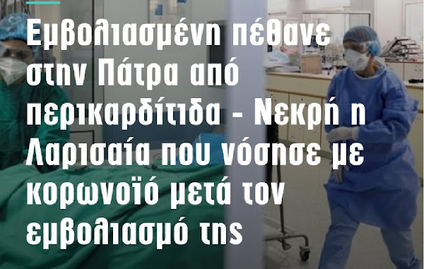 Στην Πάτρα μια 40χρονη εμβολιασμένη γυναίκα, έπαθε περικαρδίτιδα και καταχωρήθηκε ως νεκρή κορωνοϊού. Η άτυχη γυναίκα στην Πάτρα εισήχθη στο νοσοκομείο με συμπτώματα περικαρδίτιδας και μετά από λίγες ημέρες κατέληξε. Σύμφωνα με τους συγγενείς της, δεν αντιμετώπιζε κάποιο πρόβλημα με την καρδιά της και το εμφάνισε ξαφνικά. Είχε εμβολιαστεί τον Ιούλιο με το μονοδοσικό εμβόλιο της Johnson & Johnson. Ωστόσο, την Πέμπτη εμφάνισε συμπτώματα κορωνοϊού. Υπεβλήθη σε rapid test το οποίο βγήκε αρνητικό. Όμως τα συμπτώματα επέμεναν και έκανε και δεύτερο τεστ το οποίο βγήκε θετικό. Σε συνεννόηση με τον γιατρό της ξεκίνησε φαρμακευτική αγωγή και πήρε αντιβίωση. Όμως το πρωί της Τρίτης η κοπέλα κατέρρευσε μέσα στο σπίτι της. Υπέστη λιποθυμικό επεισόδιο και μεταφέρθηκε στο νοσοκομείο όπου διαπιστώθηκε ότι πάσχει από περικαρδίτιδα. Οι γιατροί συνέστησαν να μεταφερθεί στο νοσοκομείο «Άγιος Ανδρέας», όμως λίγες μέρες μετά κατέληξε.