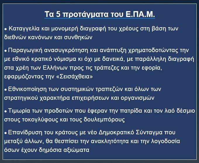 Μόνο το Ενιαίο Παλλαϊκό Μέτωπο (ΕΠΑΜ) μιλάει για 1)Μονομερή διαγραφή του συνόλου του δημόσιου χρέους σύμφωνα μάλιστα με το Διεθνές Δίκαιο. 2) Άμεση εθνικοποίηση της Τράπεζας της Ελλάδας και εκκαθάριση των τραπεζών, προστασία των καταθέσεων των πολιτών, αποζημίωση των Ασφαλιστικών Ταμείων και των μικροομολογιούχων που κουρεύτηκαν τα ομόλογά τους. Και 3) Διαγραφή των χρεών των πολιτών (όχι των απατεώνων) προς Τράπεζες, Εφορίες και Ταμεία.