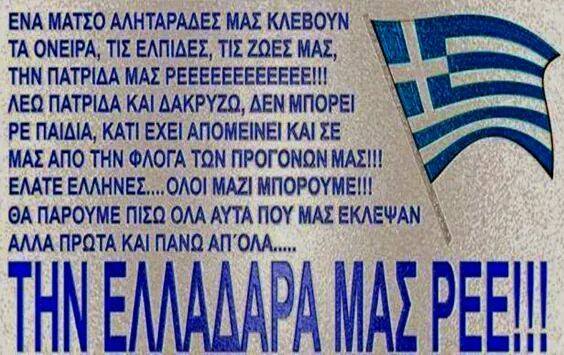 ΜΑΣ ΕΞΑΠΑΤΗΣΑΤΕ και ως κοινοί απατεώνες επί σαρανταδύο έτη εναλλάσσεσθε στην νομή της εξουσίας ως πολιτικά κόμματα, ΝΕΑ ΔΗΜΟΚΡΑΤΙΑ, ΠΑ.ΣΟ.Κ και άλλα πολιτικά μορφώματα για να φθάσουμε σήμερα στο μοιραίο συνονθύλευμα ΣΥΡΙΖΑ-ΑΝΕΛ, έχοντας κάθε φορά τη Λαϊκή Εντολή να κυβερνήσετε με βάση το πρόγραμμα που εξαγγείλατε σεβόμενοι το Σύνταγμα και τους Νόμους που συνάδουν προς αυτό. Σε αυτό το χρονικό διάστημα, με την ανερμάτιστη Κυβερνητική Πολιτική που εφαρμόσατε, διαδραματίζεται γύρω μας ένα άθλιο σχέδιο ξεπουλήματος του Ελληνισμού που αποσκοπεί στον εδαφικό ακρωτηριασμό της πατρίδας μας και στην βιολογική εξαφάνιση του Ελληνικού Έθνους το οποίο βιώνει έναν οικονομικό, πολιτικό και κοινωνικό Αρμαγεδδώνα.