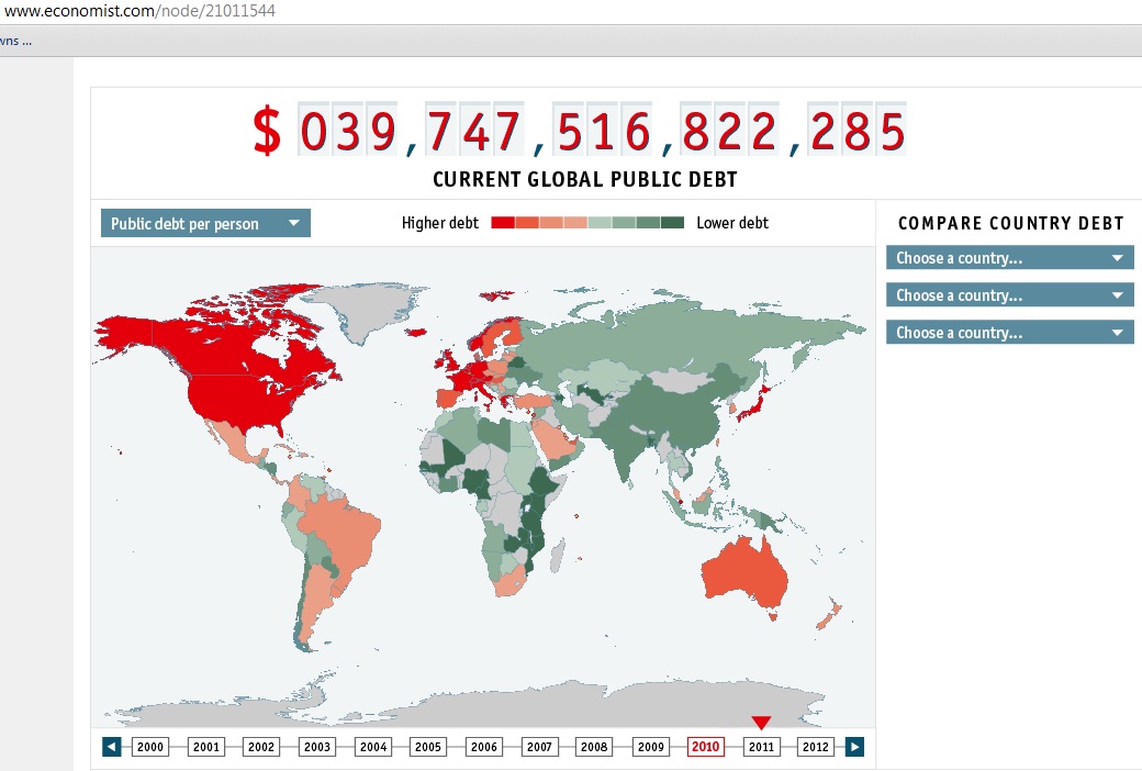 Είναι πραγματικά απίστευτο το γεγονός ότι όλες οι “μεγάλες” δυνάμεις(ΗΠΑ, Γερμανία, Αγγλία κτλ) χρωστούν τρισεκατομμύρια. Δείτε περισσότερες λεπτομέρεις στο ρολόϊ του παγκόσμιου χρέους του “Economist”