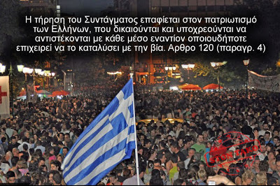 [1]Και κάτι για τις παραβιάσεις του συντάγματος που επανειλημμένα έχουμε γράψει και ιδιαίτερα αναρτώντας προ καιρού τη βαρυσήμαντη μελέτη της ΕΛ.ΛΑΣ, ότι έχει καταντήσει κουρελόχαρτο στα χέρια των μνημονιακών κυβερνήσεων: Το άρθρο 120 παρ. 4 του Συντάγματος επιτάσσει το εξής: