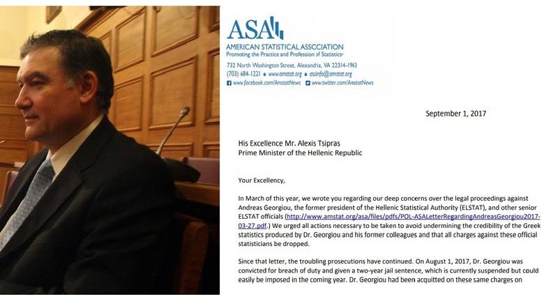 Αναλυτικά το ρεπορτάζ: Τις ανησυχίες της σχετικά με τις νομικές διαδικασίες που ακολουθούνται σχετικά με την υπόθεση του Ανδρέα Γεωργίου εκφράζει η Αμερικανική Ένωση Στατιστικών (ASA), με επιστολή της προς τον Έλληνα πρωθυπουργό, Αλέξη Τσίπρα. Η Αμερικανική Ένωση Στατιστικών κάνει λόγο για δυνητική υπονόμευση της αξιοπιστίας των ελληνικών στατιστικών, στηρίζοντας ουσιαστικά τον κ. Γεωργίου.