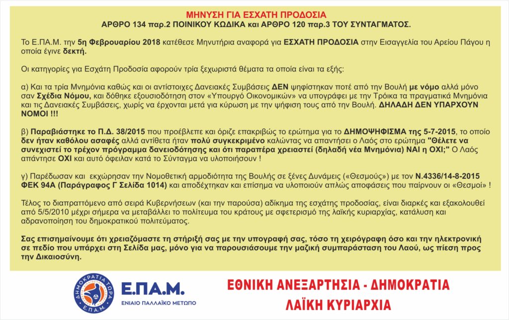 Για να αποδειχθεί του λόγου το αληθές της επιστολής, σας παραπέμπουμε σε μια διάλεξη-συζήτηση που ο πρόεδρος του ΕΠΑΜ Δημήτρης Καζάκης και ο αξιόλογος νομικός Φώτιος Σπυρίδων Μαζαράκης έκαναν στις 2 Ιουλίου του 2018 στο Γαλάτσι με θέμα την υποβολή μήνυσης εκ μέρους του ΕΠΑΜ στον Άρειο Πάγο εναντίον των μνημονιακών κυβερνήσεων επί εσχάτη προδοσία.: