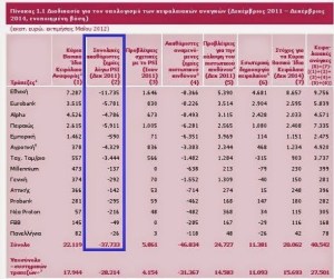 (α) Η συνολικές ακαθάριστες ζημίες των ελληνικών τραπεζών από το PSI υπολογίσθηκαν ονομαστικά στα 37,7 δις € (γράφημα) – αν και στην πραγματικότητα ήταν πολύ μεγαλύτερες, αφού λόγω της διαγραφής χρεοκόπησαν, οπότε έχασαν τα πάντα. Το δημόσιο αναγκάσθηκε να αυξήσει τα κεφάλαια τους, στη συνέχεια χάθηκαν τόσο τα δικά του χρήματα (περί τα 40 δις €), όσο και τα χρήματα των μικρών Ελλήνων επενδυτών αφού δεν επετράπη η συμμετοχή τους στην αύξηση κεφαλαίου (άρθρο), αφελληνίσθηκαν με μία μοναδική στην ιστορία απάτη, ενώ σήμερα οι τιμές των μετοχών τους συνεχίζουν να είναι στο ναδίρ. Ακόμη όμως και εάν αφαιρέσουμε μόνο τα 37,7 δις €, η ωφέλεια από το PSI περιορίζεται στα 62,44 δις € μείον 37,7 δις € – δηλαδή στα 24,74 δις €.