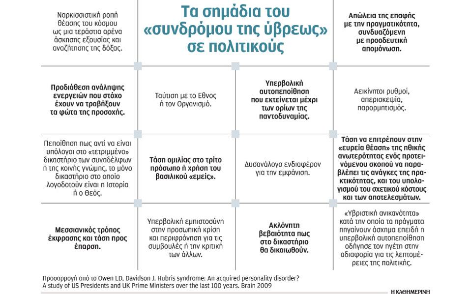 Τέλος, θα πρέπει να τονίσουμε πως η κάθε αναδρομική ή επίκαιρη ανάλυση της όποιας πολιτικής συμπεριφοράς, προσωπικότητας ή βιογραφίας δεν συνιστά εξ αποστάσεως διάγνωση ή απόπειρα υπαγωγής της ψυχιατρικής και των νευροεπιστημών σε πολιτικές σκοπιμότητες. Άλλωστε και η ίδια η ναρκισσιστική διαταραχή παρ’ ολίγον να παραλειφθεί από τα διαγνωστικά εγχειρίδια της ψυχιατρικής, (DSM=Diagnostic & Statistical Manuals of Mental Disorders) ενώ αμφισβητούμενης εγκυρότητας είναι και το σύνδρομο της ύβρεως. Αυτό δεν σημαίνει πως το συμπεριφοριολογικό τους αποτύπωμα δεν δύναται να επισημαίνεται φαινομενολογικά, να καταγράφεται και να συνοδεύεται από συμπεράσματα περί της καταστροφικής επίδρασης του θεσμικού ναρκισσισμού και της πολιτικής αλαζονείας των πολιτικών ανδρών (και γυναικών) στον δημόσιο βίο. Μακάρι να το είχε κάνει αυτό κάποιος από τους Αθηναίους για τον Αλκιβιάδη πριν από τη Σικελική Εκστρατεία. Ίσως να μην είχε επικρατήσει η ολιγαρχία…