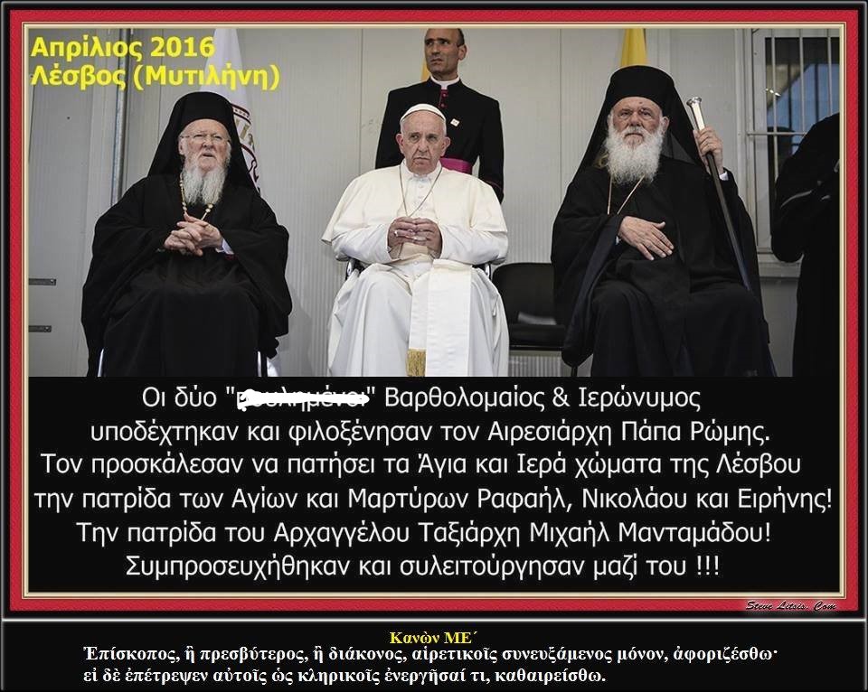Και πώς να πείτε όχι σε τέτοιες κυβερνήσεις όταν το φως της δημοσιότητας έχουν δει εναγκαλισμοί Ιεραρχών με τον τεκτονισμό-μασονία, με τον παπισμό, αιρετικά συλλείτουργα και κοινή Θεία Κοινωνία, το άναμμα των κεριών της πανθρησκείας και του οικουμενισμού…, σε παράβαση όλων των Ιερών Κανόνων και της Ιερής Παράδοσης της Εκκλησίας μας; Τι και αν πολλοί από εσάς διαφωνείτε με τα παραπάνω, αφού συνεχίζετε να τα-τους ανέχεστε;