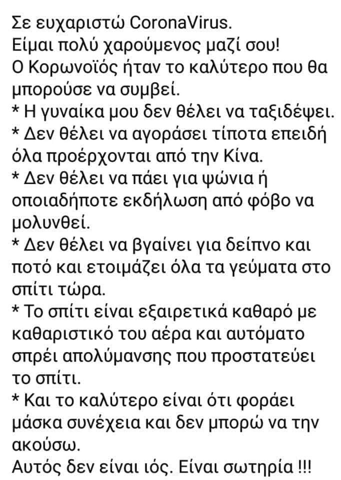 Υ.Γ.: Εν όψει καραντίνας, το να προμηθευθούμε κάποια τρόφιμα, φάρμακα, καθαριστικά για ένα δίμηνο, δεν είναι ενέργεια απιστίας ή πανικού, αλλά πρόνοιας (ώστε να αποφεύγουμε για ένα διάστημα τις άσκοπες εξόδους μας).