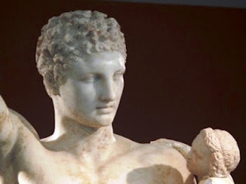 και ο Ερμής του Πραξιτέλους καθώς κρατάει ένα τσαμπί σταφύλι και το επιδεικνύει στον μικρό θεό Διόνυσο που κρατά στην αγκαλιά του